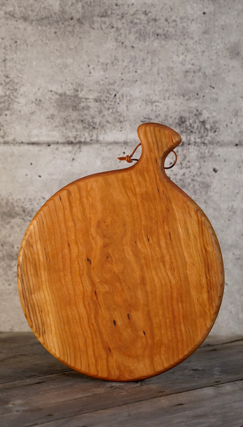 This round charcuterie board has been professionally handcrafted to showcase the natural beauty that exists within the very fibers of the wood. Take note of the warm cherry tones, dark gum inclusions and striking grain on this classic round.